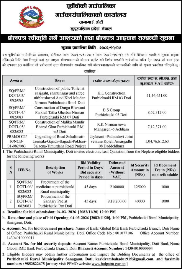 बोलपत्र स्वीकृति गर्ने आशयको तथा बोलपत्र आहवान सम्बन्धी सूचना ।।