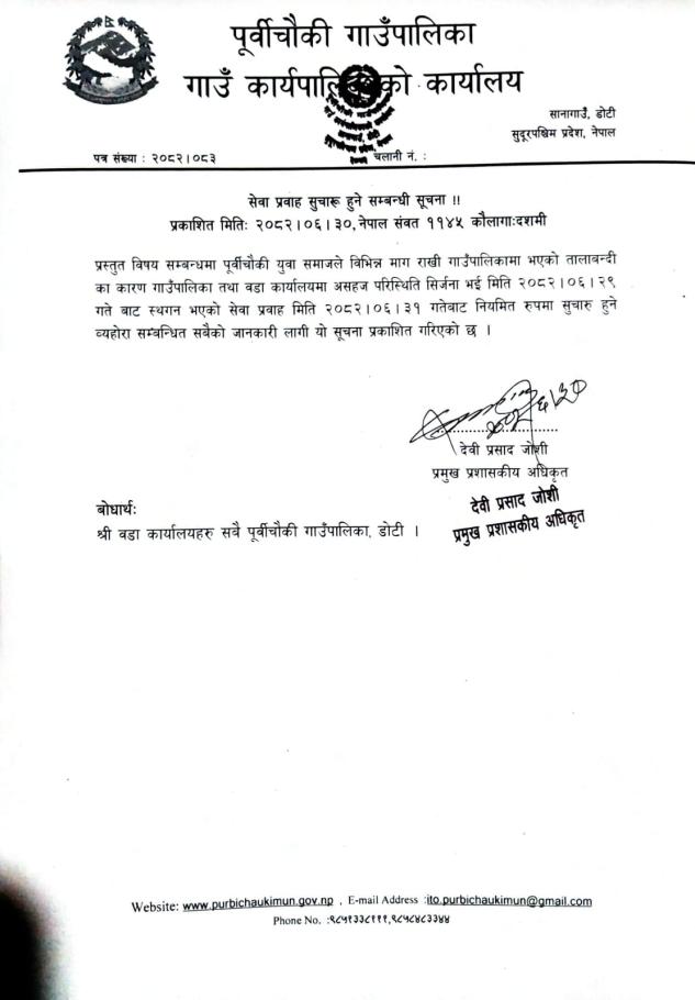 सेवा प्रवाह सुचारु हुने सम्बन्धी सूचना ।।