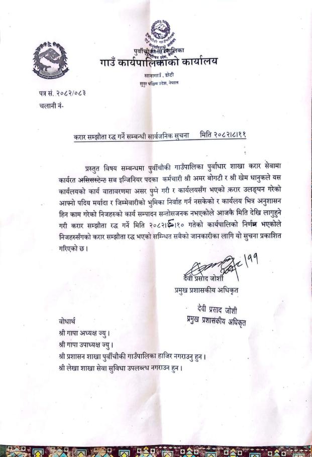 करार सम्झौता रद्ध गर्ने सम्बन्धी सार्वजनिक सूचना ।।