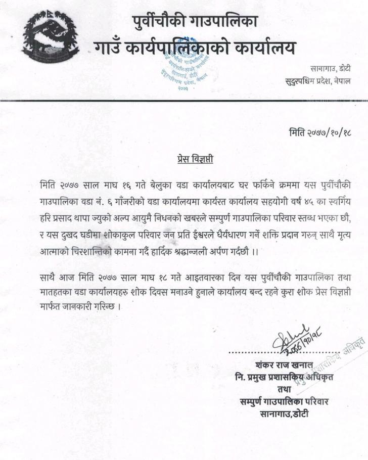 मनोसामाजिक परामर्श कर्ता पदको लिखित परिक्षा स्थगित सम्बन्धी सार्वजनिक सूचना ।