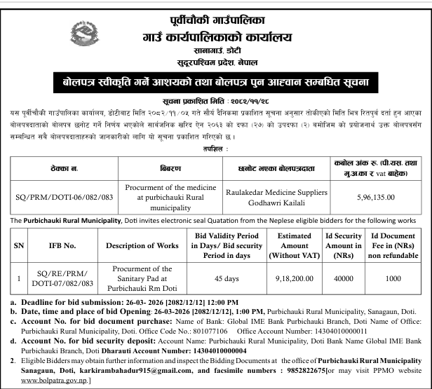 बोलपत्र स्वीकृति गर्ने आशयको तथा बोलपत्र आहवान सम्बन्धी सूचना ।।